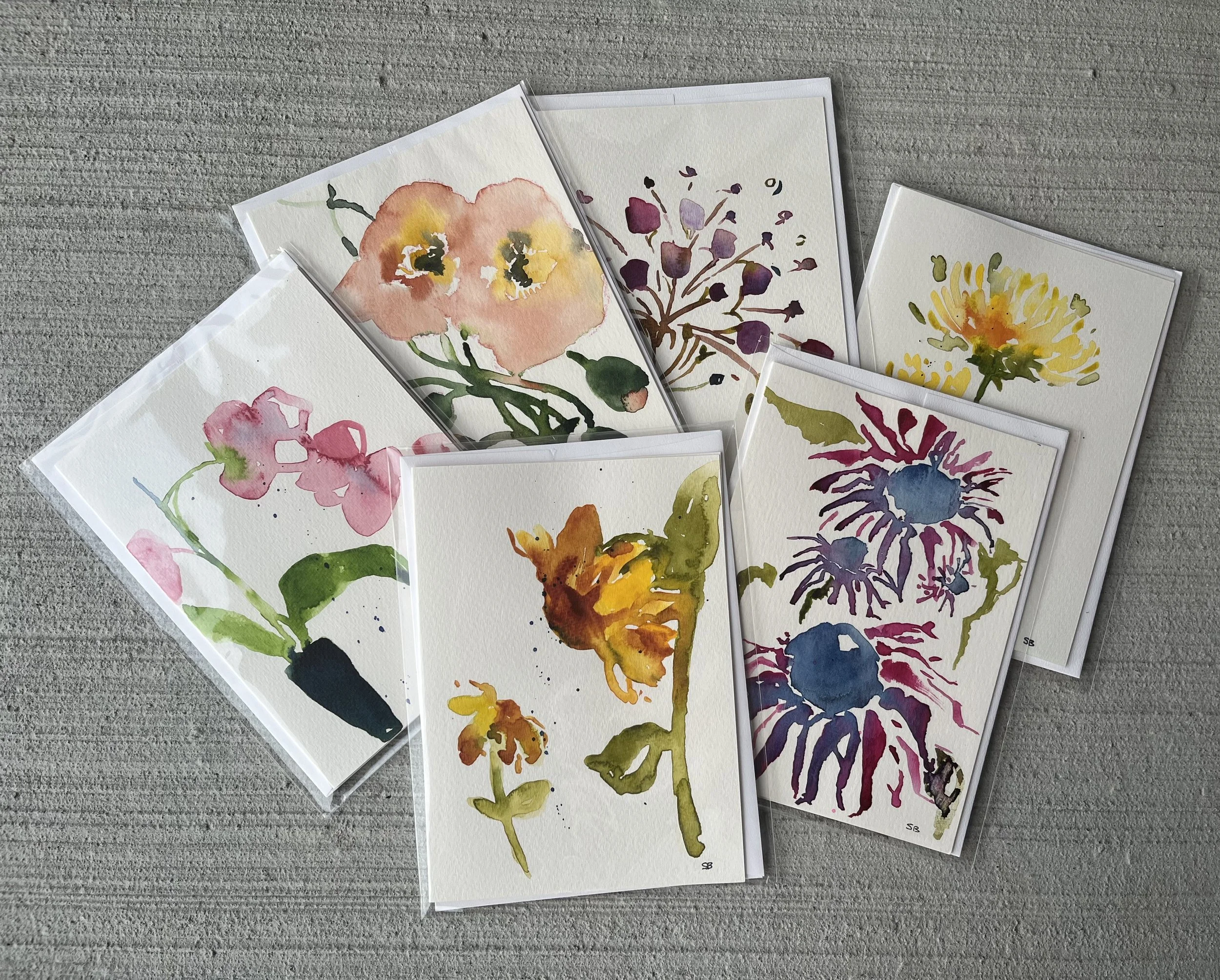 Original watercolour paintings, grouping selected by the artist. Images are a good representation of what you will receive, although each card is an original and won’t be exactly as shown.
